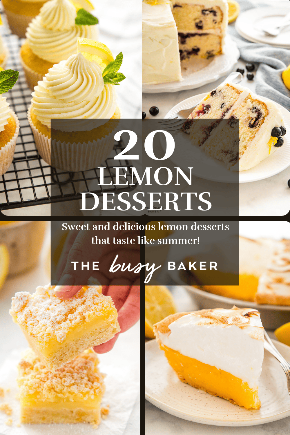 If you love bright, fresh desserts, these Lemon Desserts are for you. This collection of 20 homemade lemon recipes includes everything from no bake cheesecake and lemon tart to lemon meringue pie, lemon crumb bars, lemon blueberry cake, cupcakes, lemon curd, lemon meringue nests, and more delicious lemon cakes. Whether you’re craving something rich and creamy or light and citrusy, something baked or something no-bake, these lemon desserts are perfect for spring, summer, and every lemon lover!