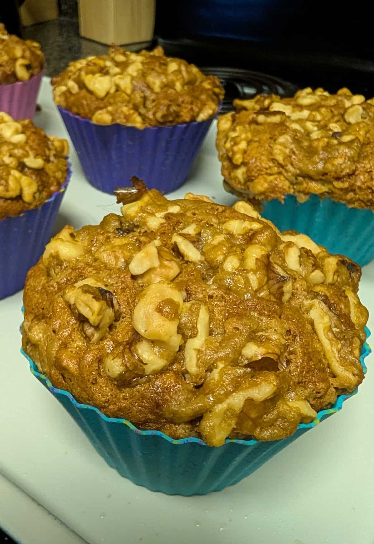 - Spoon the muffin batter evenly into the 12 muffin cups and spoon a bit of the coated walnuts onto the top of each one, making sure the topping is well distributed onto the top of each muffin (not in one big clump or it might sink into the muffin as it bakes!).