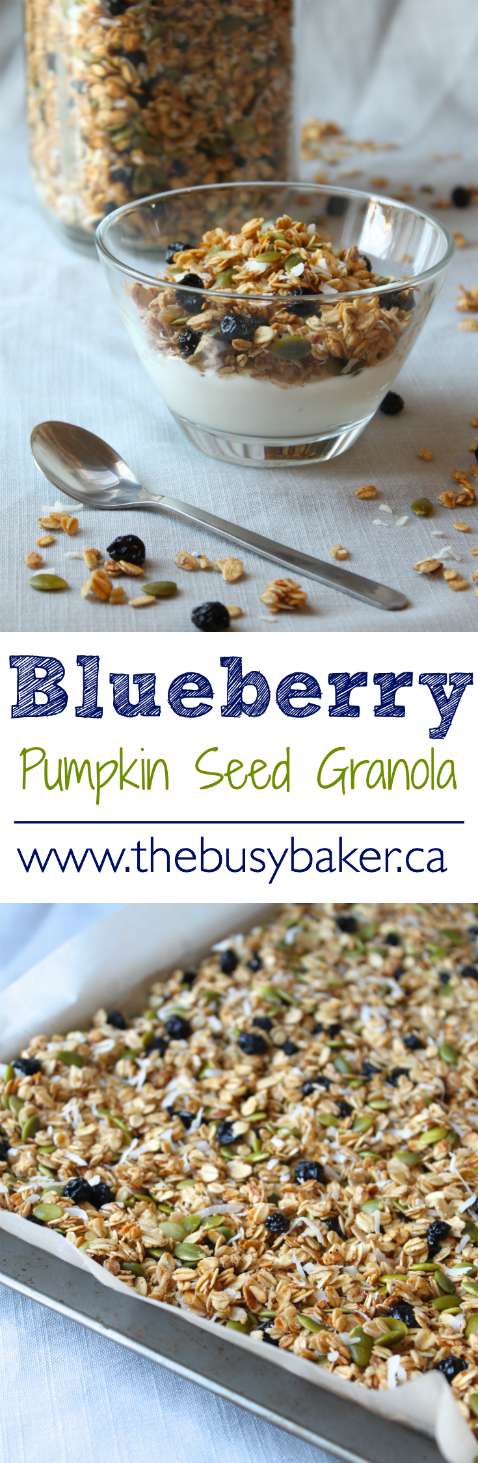 This Pumpkin Seed Granola with Blueberries is a stove top granola recipe that makes a healthy breakfast. Naturally sweetened with honey and maple syrup.