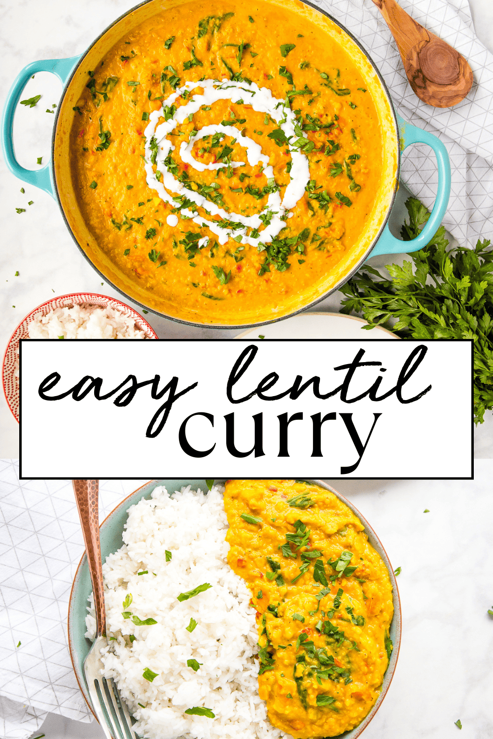 This Easy Lentil Curry is the perfect easy and healthy weeknight meal that can be made vegetarian, vegan and dairy-free! Skip the Indian restaurant and make this delicious Indian-style red lentil curry recipe at home in 30 minutes or less!