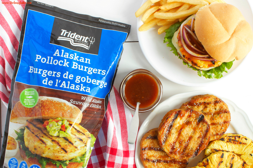 I’ve always loved the idea of Hawaiian flavours with fish and these Trident Seafoods® Wild Alaskan Pollock Burgers taste SO good with a slice of fresh, grilled pineapple! I paired them with some teriyaki sauce for some extra flavour and some delicious Monterey jack cheese…and let me tell you – they were delicious!! Wild Alaska Pollock is so mild in flavor, like cod, and so it goes well with bold flavours like pineapple and teriyaki. These burgers are pretty much perfection!